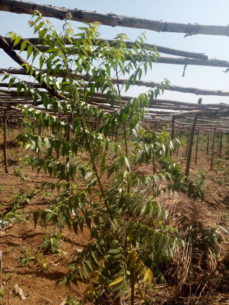In der Zwischenzeit kann man die Bäume unseres "Obstgartens" besser erkennen: sie gewinnen langsam an Höhe. Der Neembaum, ein Baum dessen Blätter medizinisch nutzbar sind (rechts im Bild), wird bei uns um die Felder und in deren Mitte gepflanzt - und zwar als Insektenschutzmittel, denn der Geruch des Neembaum hat einen abweisenden Effekt auf Nematoden und andere Parasiten. Ausserdem wird er uns eines Tages, wenn er seine volle Größe erreicht hat, seinen wunderbaren Schatten schenken.